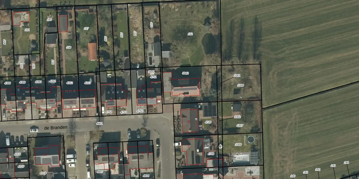 Het perceel waarop de Branden 47 staat heeft een oppervlakte van 615 m². Dit is een groot perceel. De perceeloppervlakte wordt geregistreerd door het Kadaster. Gedetailleerde informatie over de maten van dit perceel kunt u vinden in het rapport Kadastrale kaart met maatvoering van de Branden 47.