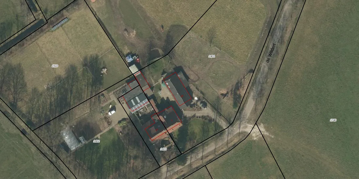 Het perceel waarop de Wildert 1-B staat heeft een oppervlakte van 4245 m². Dit is een zeer groot perceel. De perceeloppervlakte wordt geregistreerd door het Kadaster. Gedetailleerde informatie over de maten van dit perceel kunt u vinden in het rapport Kadastrale kaart met maatvoering van de Wildert 1-B.