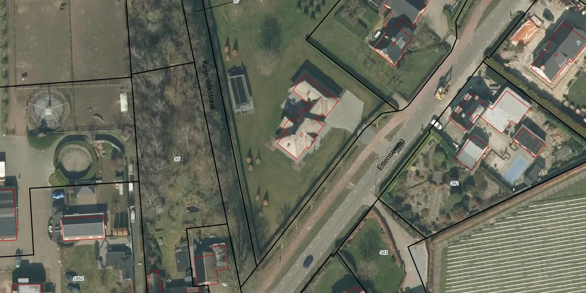 Het perceel waarop Ettenseweg 27 staat heeft een oppervlakte van 5745 m². Dit is een zeer groot perceel. De perceeloppervlakte wordt geregistreerd door het Kadaster. Gedetailleerde informatie over de maten van dit perceel kunt u vinden in het rapport Kadastrale kaart met maatvoering van Ettenseweg 27.