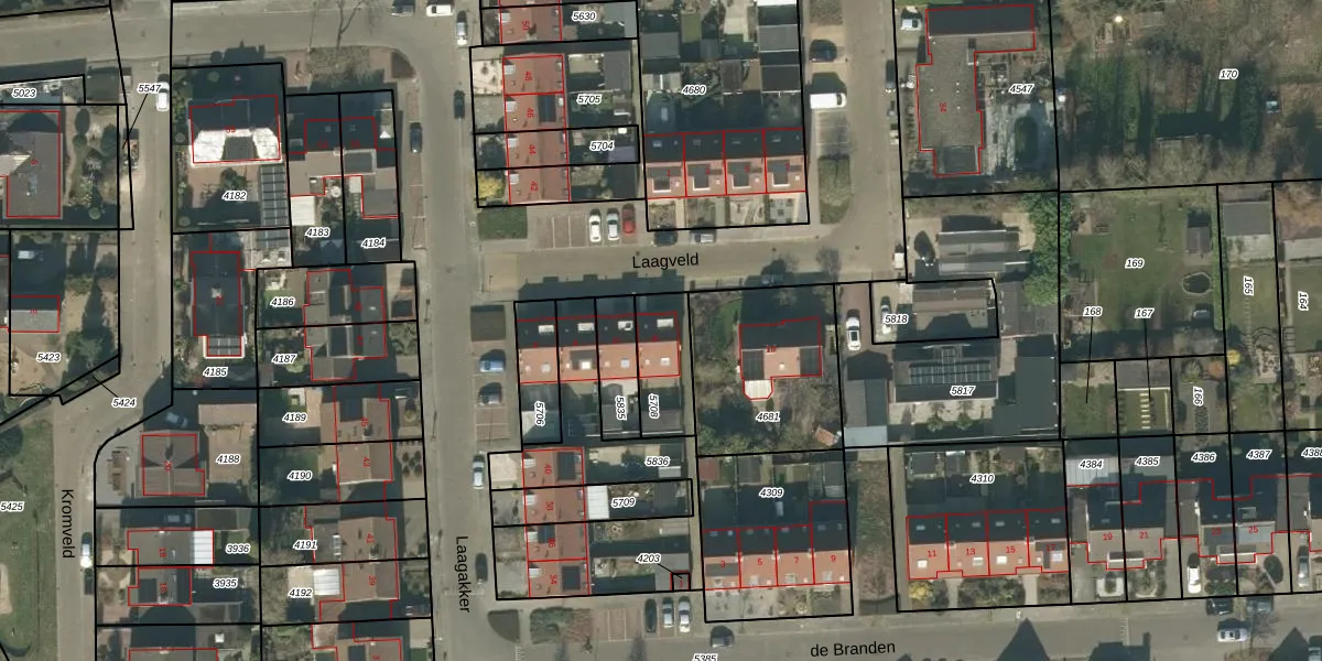 Het perceel waarop Laagveld 8 staat heeft een oppervlakte van 180 m². Dit is een middelgroot perceel. De perceeloppervlakte wordt geregistreerd door het Kadaster. Gedetailleerde informatie over de maten van dit perceel kunt u vinden in het rapport Kadastrale kaart met maatvoering van Laagveld 8.