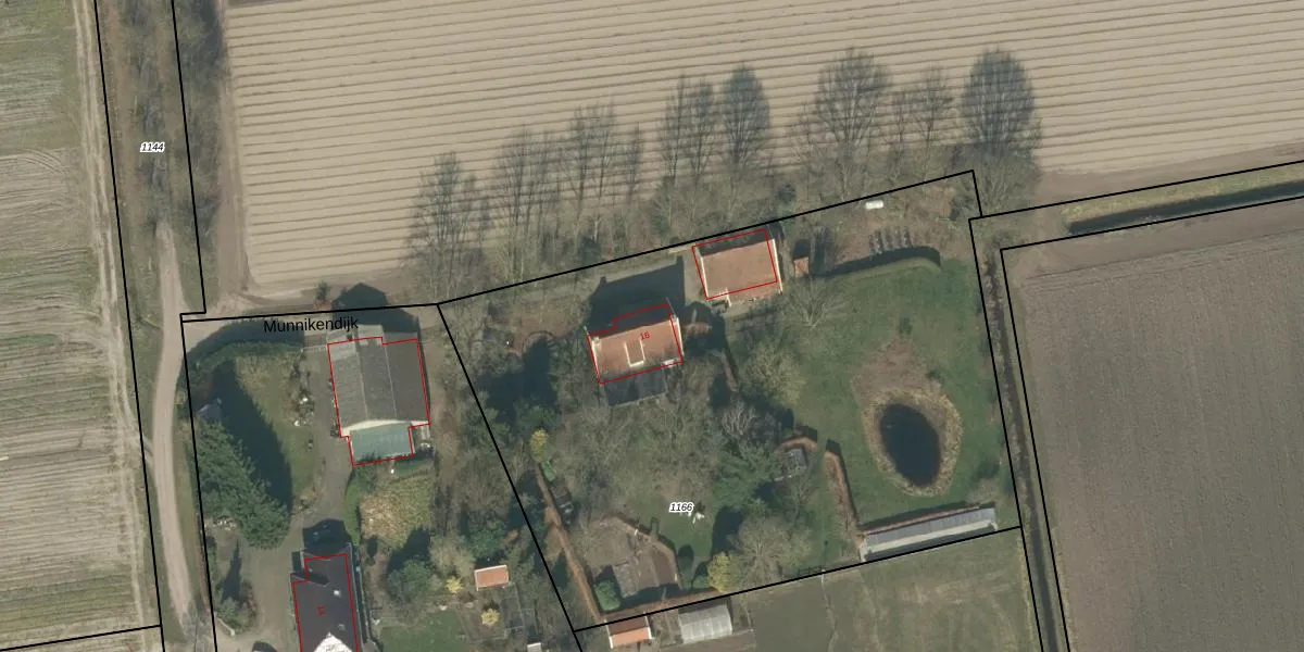 Munnikendijk 16 is gelegen op kadastraal perceel RPN00T1166. Deze kadastrale aanduiding is uniek en wordt gebruikt door het Kadaster om eigendomsrechten en andere zakelijke rechten vast te leggen. Het perceel maakt onderdeel uit van de kadastrale gemeente Rucphen.