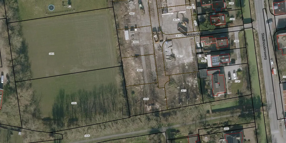 Het perceel waarop Middenhôf 12 staat heeft een oppervlakte van 467 m². Dit is een groot perceel. De perceeloppervlakte wordt geregistreerd door het Kadaster. Gedetailleerde informatie over de maten van dit perceel kunt u vinden in het rapport Kadastrale kaart met maatvoering van Middenhôf 12.