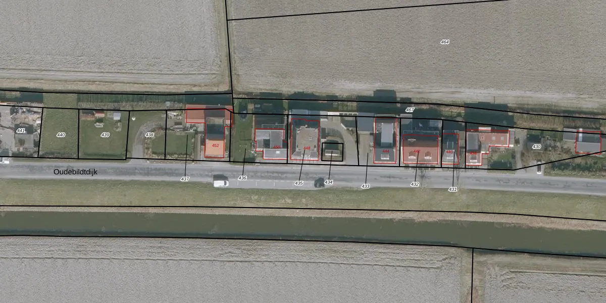 Het perceel waarop Oudebildtdijk 448 staat heeft een oppervlakte van 335 m². Dit is een groot perceel. De perceeloppervlakte wordt geregistreerd door het Kadaster. Gedetailleerde informatie over de maten van dit perceel kunt u vinden in het rapport Kadastrale kaart met maatvoering van Oudebildtdijk 448.