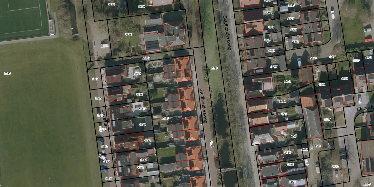Het perceel waarop Stadhoudersweg 21 staat heeft een oppervlakte van 2148 m². Dit is een zeer groot perceel. De perceeloppervlakte wordt geregistreerd door het Kadaster. Gedetailleerde informatie over de maten van dit perceel kunt u vinden in het rapport Kadastrale kaart met maatvoering van Stadhoudersweg 21.
