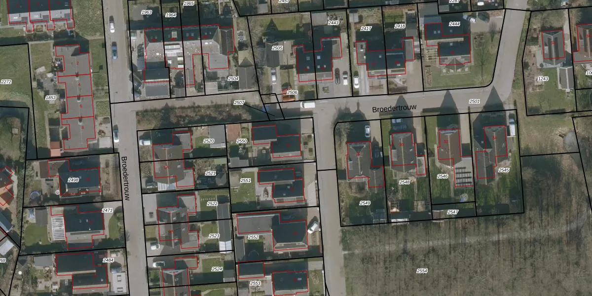 Het perceel waarop Broedertrouw 21 staat heeft een oppervlakte van 448 m². Dit is een groot perceel. De perceeloppervlakte wordt geregistreerd door het Kadaster. Gedetailleerde informatie over de maten van dit perceel kunt u vinden in het rapport Kadastrale kaart met maatvoering van Broedertrouw 21.
