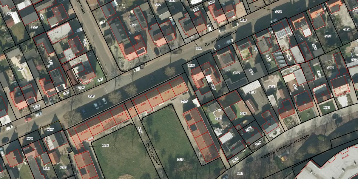 Het adres is gelegen op perceel 7525 in de sectie D en de kadastrale gemeente Rucphen. De kadastrale aanduiding is aldus RPN00-D-7525. Het perceel is 1030 m² groot. Dat is kleiner dan de gemiddelde perceeloppervlakte in Rucphen, dat op 4092,36 m² ligt. Het grootste perceel in de kadastrale gemeente is 43,3 ha. Het kleinste perceel heeft een oppervlakte van 0 m². Op het perceel liggen in totaal 12 adressen. De huidige grenzen van het perceel zijn digitaal in de Basisregistratie Kadaster (BRK) geregistreerd op 28-09-2009.