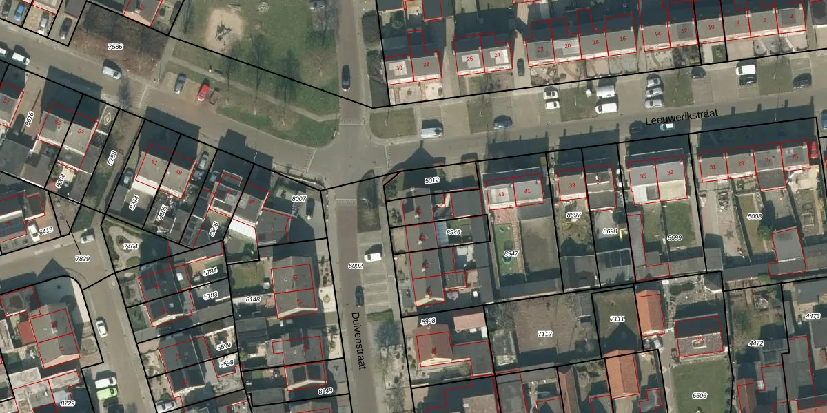 Het perceel waarop Duivenstraat 18 staat heeft een oppervlakte van 1085 m². Dit is een zeer groot perceel. De perceeloppervlakte wordt geregistreerd door het Kadaster. Gedetailleerde informatie over de maten van dit perceel kunt u vinden in het rapport Kadastrale kaart met maatvoering van Duivenstraat 18.
