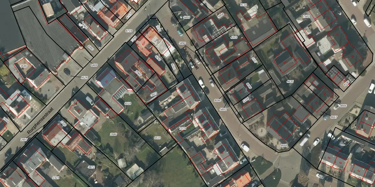 Duivenstraat 43 is gelegen op kadastraal perceel RPN00D7579. Deze kadastrale aanduiding is uniek en wordt gebruikt door het Kadaster om eigendomsrechten en andere zakelijke rechten vast te leggen. Het perceel maakt onderdeel uit van de kadastrale gemeente Rucphen.