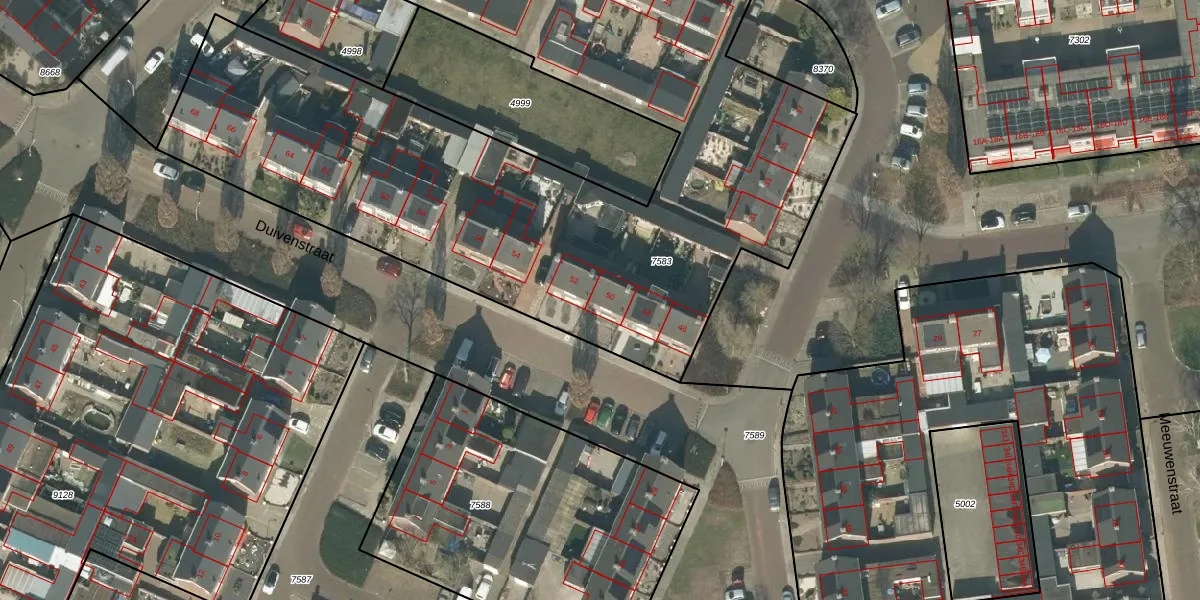 Het perceel waarop Duivenstraat 50 staat heeft een oppervlakte van 4756 m². Dit is een zeer groot perceel. De perceeloppervlakte wordt geregistreerd door het Kadaster. Gedetailleerde informatie over de maten van dit perceel kunt u vinden in het rapport Kadastrale kaart met maatvoering van Duivenstraat 50.