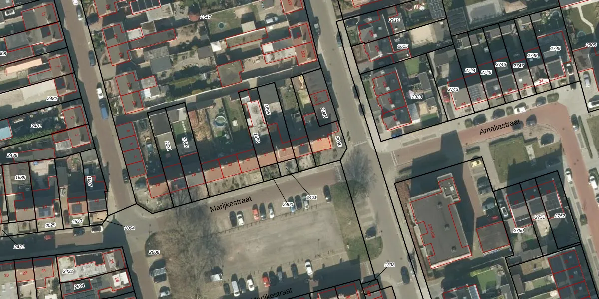 Het perceel waarop Marijkestraat 41 staat heeft een oppervlakte van 7639 m². Dit is een zeer groot perceel. De perceeloppervlakte wordt geregistreerd door het Kadaster. Gedetailleerde informatie over de maten van dit perceel kunt u vinden in het rapport Kadastrale kaart met maatvoering van Marijkestraat 41.