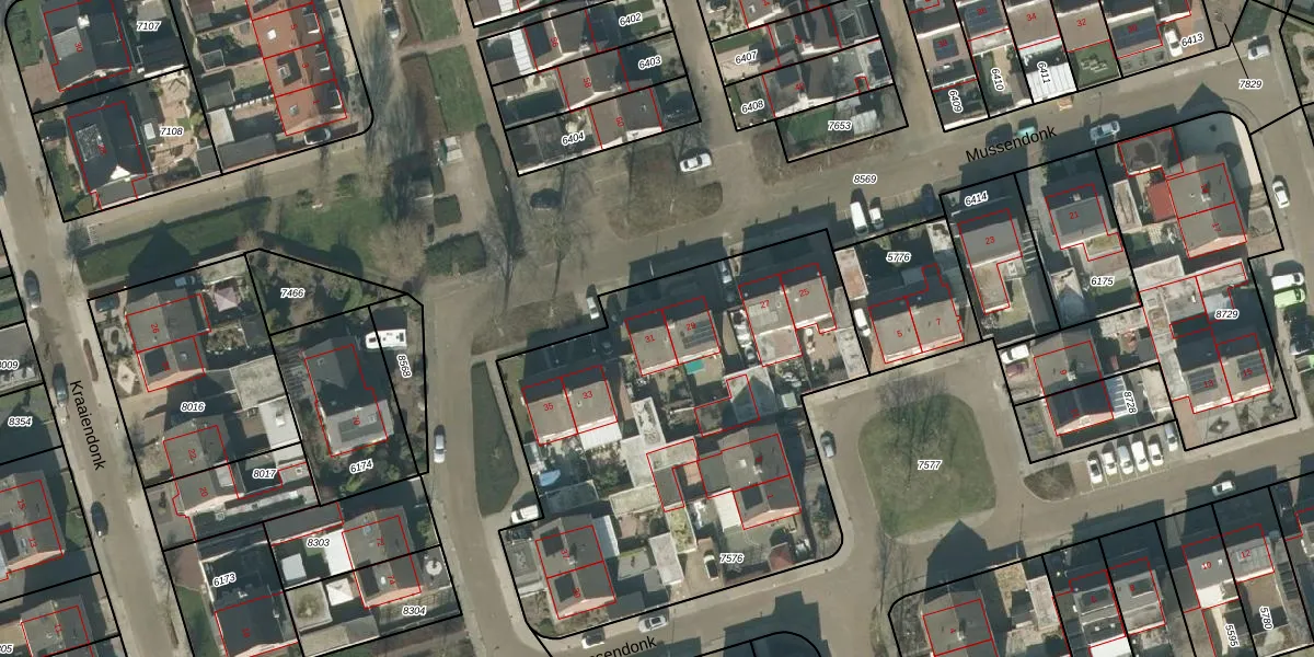 Het perceel waarop Mussendonk 31 staat heeft een oppervlakte van 2348 m². Dit is een zeer groot perceel. De perceeloppervlakte wordt geregistreerd door het Kadaster. Gedetailleerde informatie over de maten van dit perceel kunt u vinden in het rapport Kadastrale kaart met maatvoering van Mussendonk 31.