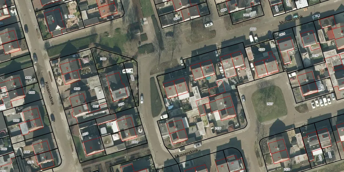 Het perceel waarop Mussendonk 35 staat heeft een oppervlakte van 2348 m². Dit is een zeer groot perceel. De perceeloppervlakte wordt geregistreerd door het Kadaster. Gedetailleerde informatie over de maten van dit perceel kunt u vinden in het rapport Kadastrale kaart met maatvoering van Mussendonk 35.