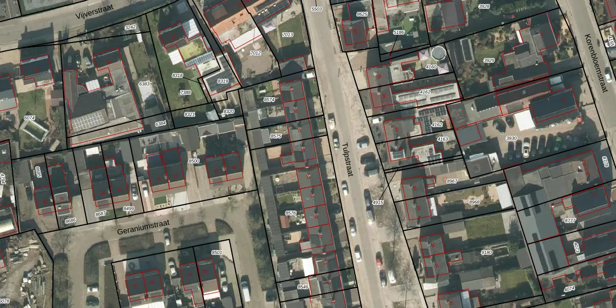 Het perceel waarop Tulpstraat 55 staat heeft een oppervlakte van 1123 m². Dit is een zeer groot perceel. De perceeloppervlakte wordt geregistreerd door het Kadaster. Gedetailleerde informatie over de maten van dit perceel kunt u vinden in het rapport Kadastrale kaart met maatvoering van Tulpstraat 55.