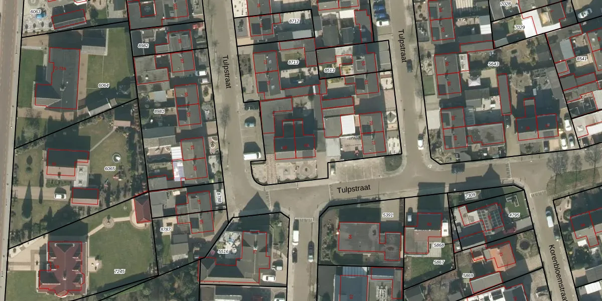Het perceel waarop Tulpstraat 66 staat heeft een oppervlakte van 2531 m². Dit is een zeer groot perceel. De perceeloppervlakte wordt geregistreerd door het Kadaster. Gedetailleerde informatie over de maten van dit perceel kunt u vinden in het rapport Kadastrale kaart met maatvoering van Tulpstraat 66.