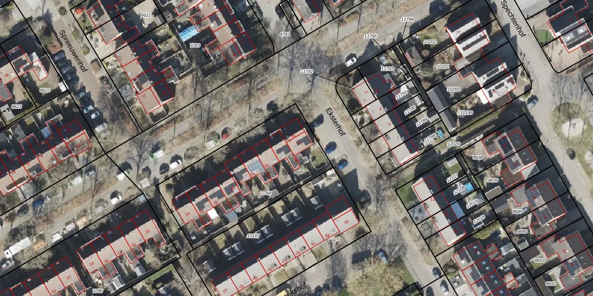 Het perceel waarop Eksterhof 2 staat heeft een oppervlakte van 1367 m². Dit is een zeer groot perceel. De perceeloppervlakte wordt geregistreerd door het Kadaster. Gedetailleerde informatie over de maten van dit perceel kunt u vinden in het rapport Kadastrale kaart met maatvoering van Eksterhof 2.
