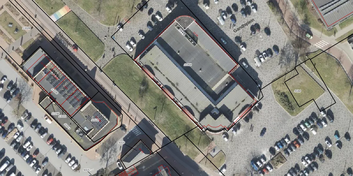 Het perceel waarop Gandhiplein 30 staat heeft een oppervlakte van 3465 m². Dit is een zeer groot perceel. De perceeloppervlakte wordt geregistreerd door het Kadaster. Gedetailleerde informatie over de maten van dit perceel kunt u vinden in het rapport Kadastrale kaart met maatvoering van Gandhiplein 30.
