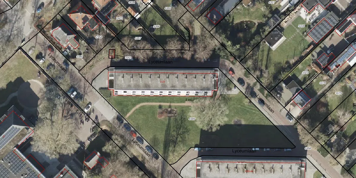 Het perceel waarop Lyceumlaan 19 staat heeft een oppervlakte van 3665 m². Dit is een zeer groot perceel. De perceeloppervlakte wordt geregistreerd door het Kadaster. Gedetailleerde informatie over de maten van dit perceel kunt u vinden in het rapport Kadastrale kaart met maatvoering van Lyceumlaan 19.