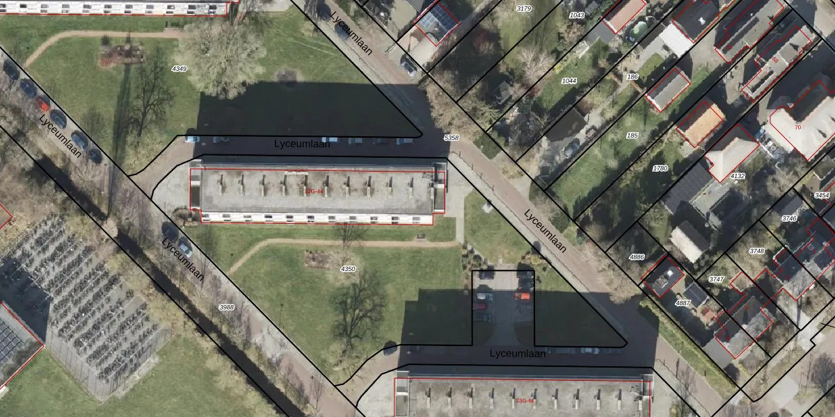 Het perceel waarop Lyceumlaan 44 staat heeft een oppervlakte van 3395 m². Dit is een zeer groot perceel. De perceeloppervlakte wordt geregistreerd door het Kadaster. Gedetailleerde informatie over de maten van dit perceel kunt u vinden in het rapport Kadastrale kaart met maatvoering van Lyceumlaan 44.