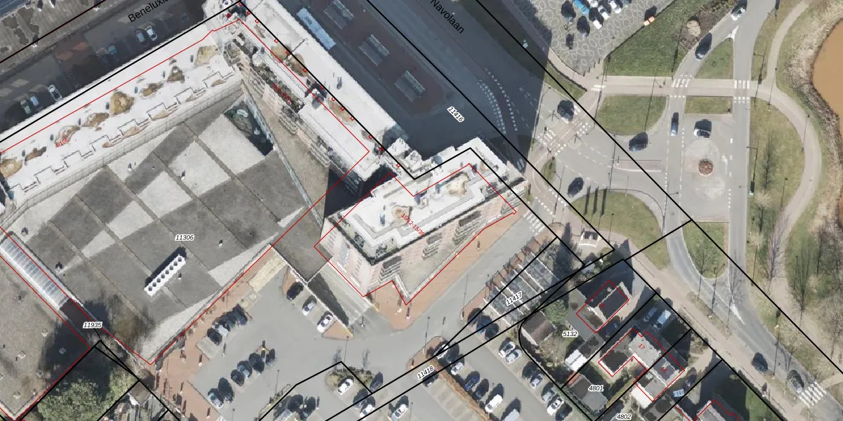 Het perceel waarop Navolaan 15-25 staat heeft een oppervlakte van 9465 m². Dit is een zeer groot perceel. De perceeloppervlakte wordt geregistreerd door het Kadaster. Gedetailleerde informatie over de maten van dit perceel kunt u vinden in het rapport Kadastrale kaart met maatvoering van Navolaan 15-25.