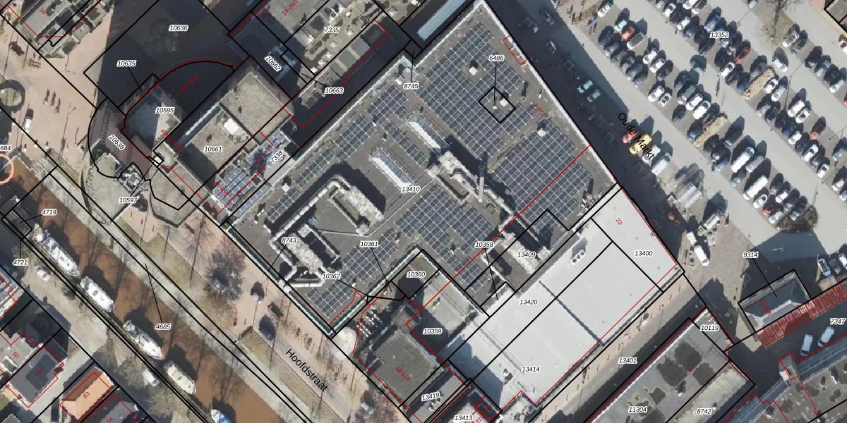 Het perceel waarop Oude Markt 1-J staat heeft een oppervlakte van 3588 m². Dit is een zeer groot perceel. De perceeloppervlakte wordt geregistreerd door het Kadaster. Gedetailleerde informatie over de maten van dit perceel kunt u vinden in het rapport Kadastrale kaart met maatvoering van Oude Markt 1-J.