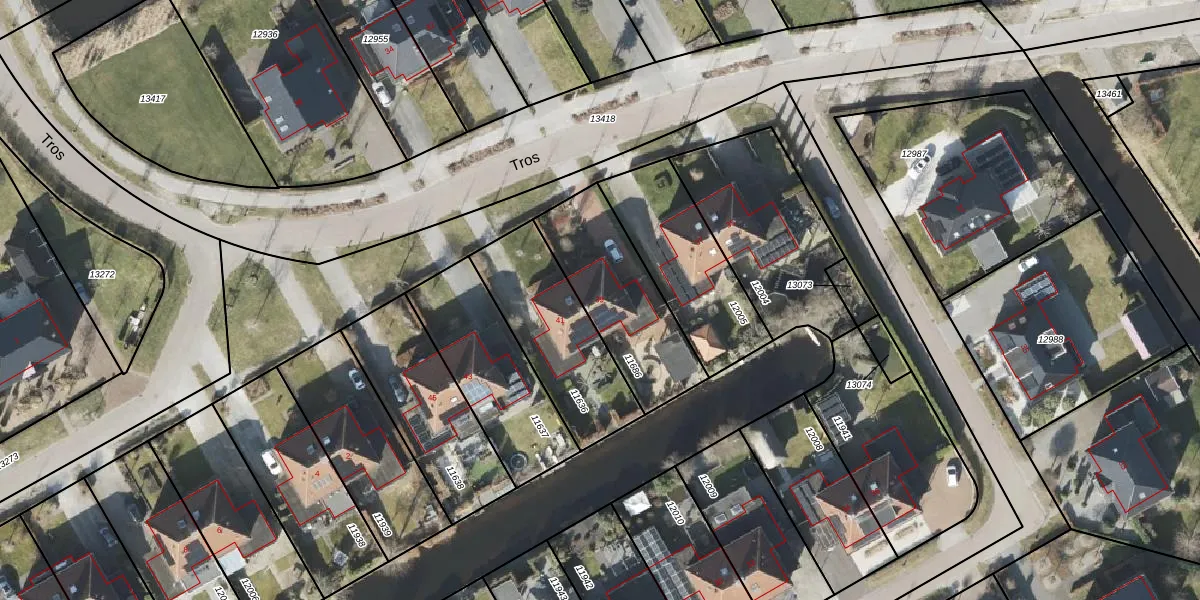 Het perceel waarop Tros 39 staat heeft een oppervlakte van 462 m². Dit is een groot perceel. De perceeloppervlakte wordt geregistreerd door het Kadaster. Gedetailleerde informatie over de maten van dit perceel kunt u vinden in het rapport Kadastrale kaart met maatvoering van Tros 39.