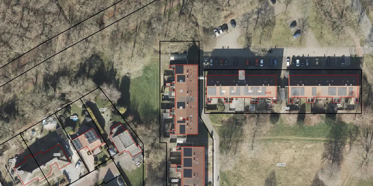 Het perceel waarop Wulp 33 staat heeft een oppervlakte van 3363 m². Dit is een zeer groot perceel. De perceeloppervlakte wordt geregistreerd door het Kadaster. Gedetailleerde informatie over de maten van dit perceel kunt u vinden in het rapport Kadastrale kaart met maatvoering van Wulp 33.