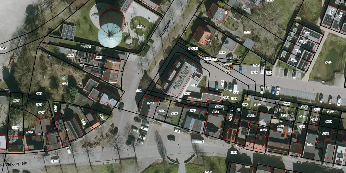 Het perceel waarop Brugstraat 2-f staat heeft een oppervlakte van 689 m². Dit is een groot perceel. De perceeloppervlakte wordt geregistreerd door het Kadaster. Gedetailleerde informatie over de maten van dit perceel kunt u vinden in het rapport Kadastrale kaart met maatvoering van Brugstraat 2-f.