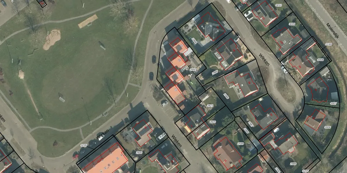 Het perceel waarop Wieken 76 staat heeft een oppervlakte van 860 m². Dit is een groot perceel. De perceeloppervlakte wordt geregistreerd door het Kadaster. Gedetailleerde informatie over de maten van dit perceel kunt u vinden in het rapport Kadastrale kaart met maatvoering van Wieken 76.
