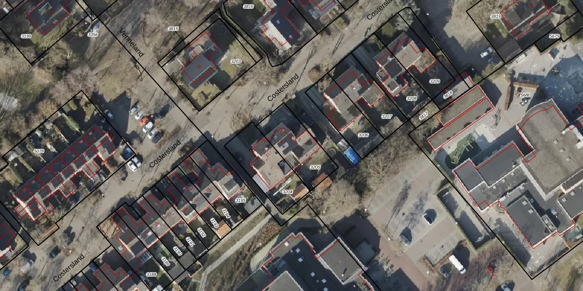 Het perceel waarop Costersland 9 staat heeft een oppervlakte van 363 m². Dit is een groot perceel. De perceeloppervlakte wordt geregistreerd door het Kadaster. Gedetailleerde informatie over de maten van dit perceel kunt u vinden in het rapport Kadastrale kaart met maatvoering van Costersland 9.