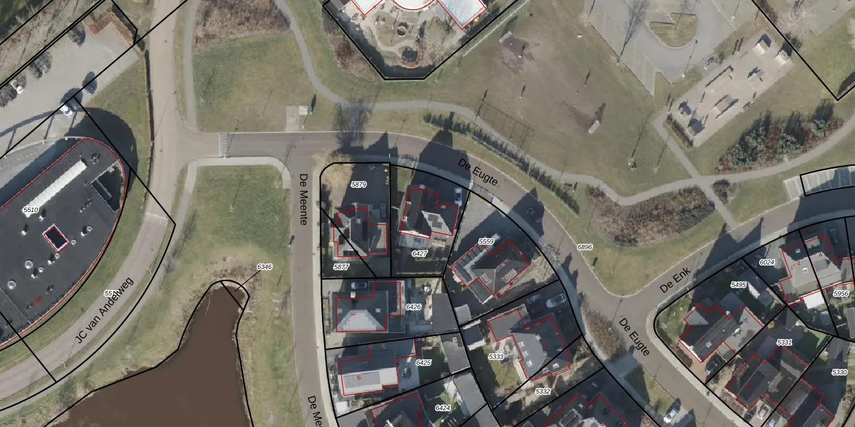 Het perceel waarop De Eugte 2 staat heeft een oppervlakte van 381 m². Dit is een groot perceel. De perceeloppervlakte wordt geregistreerd door het Kadaster. Gedetailleerde informatie over de maten van dit perceel kunt u vinden in het rapport Kadastrale kaart met maatvoering van De Eugte 2.