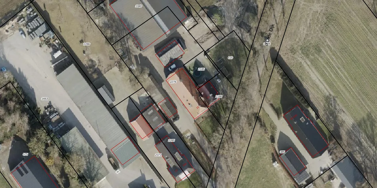 Het perceel waarop d'Olde Dijk 15 staat heeft een oppervlakte van 2247 m². Dit is een zeer groot perceel. De perceeloppervlakte wordt geregistreerd door het Kadaster. Gedetailleerde informatie over de maten van dit perceel kunt u vinden in het rapport Kadastrale kaart met maatvoering van d'Olde Dijk 15.