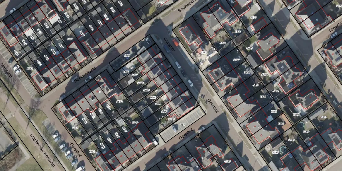 Het perceel waarop Gersthof 6 staat heeft een oppervlakte van 175 m². Dit is een middelgroot perceel. De perceeloppervlakte wordt geregistreerd door het Kadaster. Gedetailleerde informatie over de maten van dit perceel kunt u vinden in het rapport Kadastrale kaart met maatvoering van Gersthof 6.