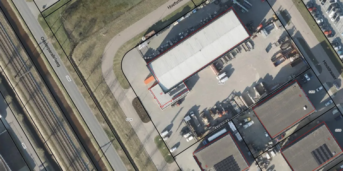 Het perceel waarop Hoefsmid 20 staat heeft een oppervlakte van 6205 m². Dit is een zeer groot perceel. De perceeloppervlakte wordt geregistreerd door het Kadaster. Gedetailleerde informatie over de maten van dit perceel kunt u vinden in het rapport Kadastrale kaart met maatvoering van Hoefsmid 20.