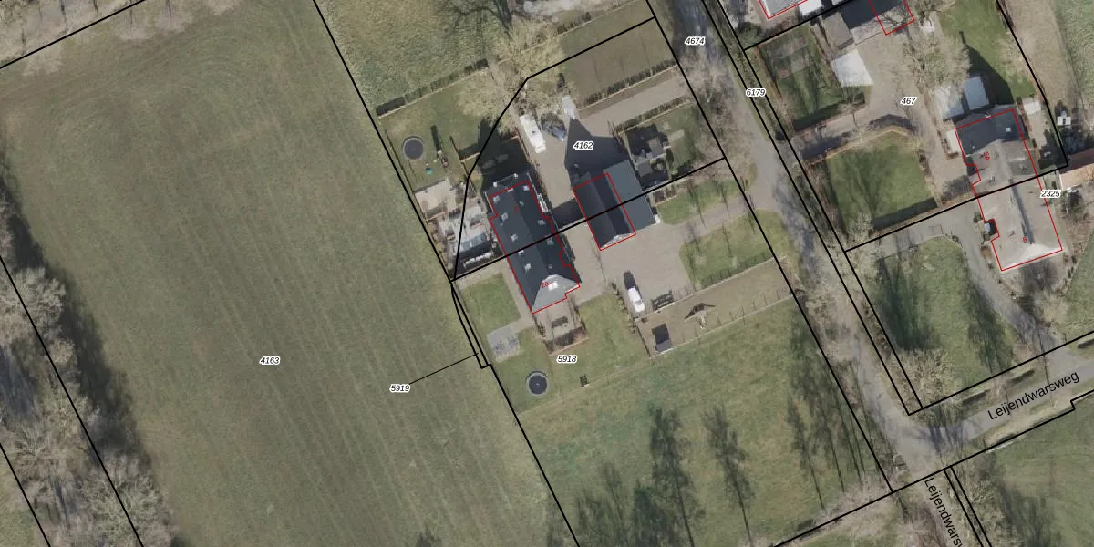 Het perceel waarop Leijendwarsweg 2-a staat heeft een oppervlakte van 3820 m². Dit is een zeer groot perceel. De perceeloppervlakte wordt geregistreerd door het Kadaster. Gedetailleerde informatie over de maten van dit perceel kunt u vinden in het rapport Kadastrale kaart met maatvoering van Leijendwarsweg 2-a.