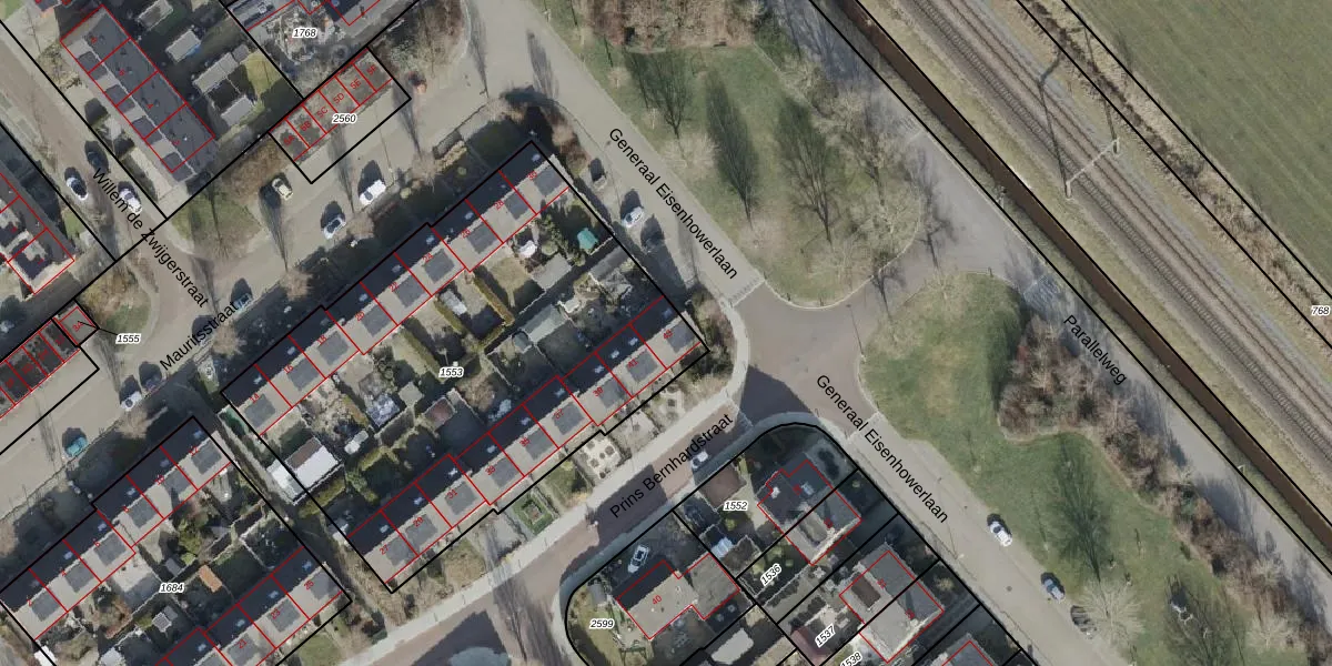 Het perceel waarop Prins Bernhardstraat 43 staat heeft een oppervlakte van 2390 m². Dit is een zeer groot perceel. De perceeloppervlakte wordt geregistreerd door het Kadaster. Gedetailleerde informatie over de maten van dit perceel kunt u vinden in het rapport Kadastrale kaart met maatvoering van Prins Bernhardstraat 43.