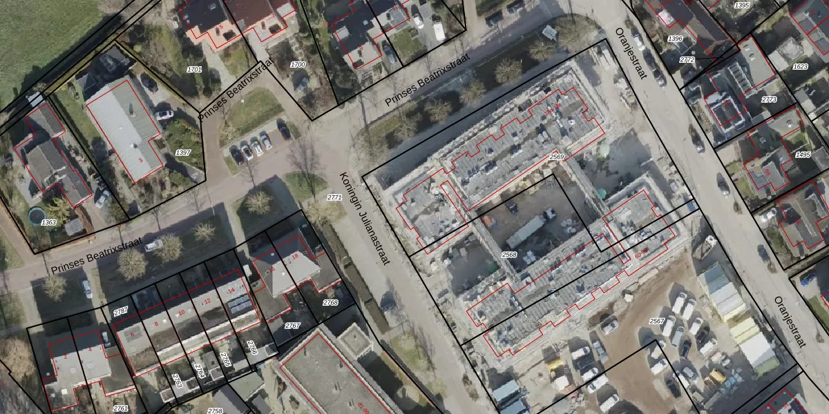 Het perceel waarop Prinses Beatrixstraat 18-f staat heeft een oppervlakte van 2078 m². Dit is een zeer groot perceel. De perceeloppervlakte wordt geregistreerd door het Kadaster. Gedetailleerde informatie over de maten van dit perceel kunt u vinden in het rapport Kadastrale kaart met maatvoering van Prinses Beatrixstraat 18-f.