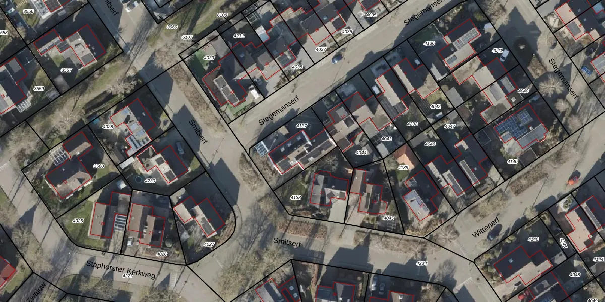 Het perceel waarop Smitserf 15 staat heeft een oppervlakte van 416 m². Dit is een groot perceel. De perceeloppervlakte wordt geregistreerd door het Kadaster. Gedetailleerde informatie over de maten van dit perceel kunt u vinden in het rapport Kadastrale kaart met maatvoering van Smitserf 15.