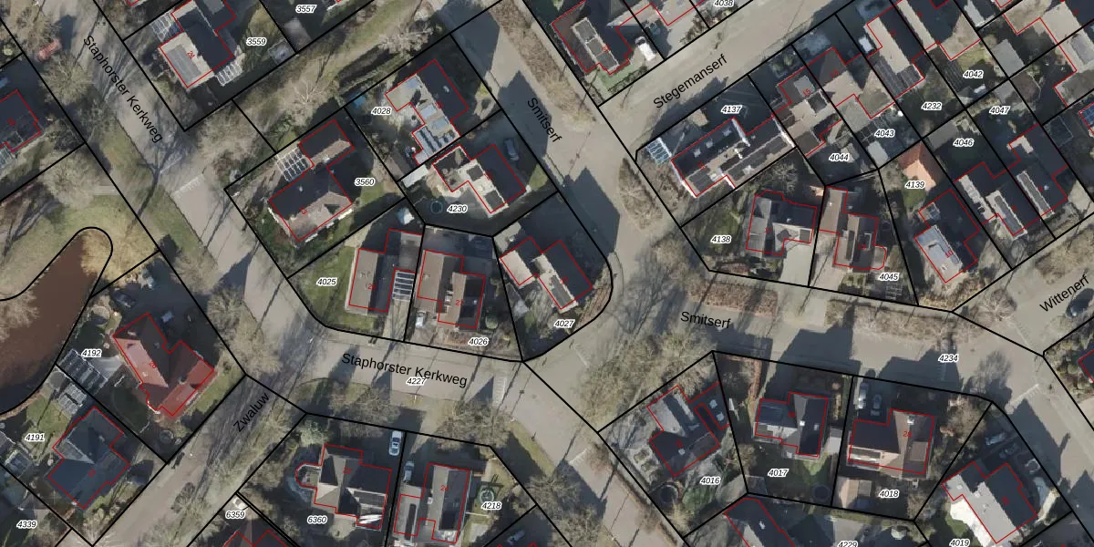 Het perceel waarop Smitserf 24 staat heeft een oppervlakte van 422 m². Dit is een groot perceel. De perceeloppervlakte wordt geregistreerd door het Kadaster. Gedetailleerde informatie over de maten van dit perceel kunt u vinden in het rapport Kadastrale kaart met maatvoering van Smitserf 24.