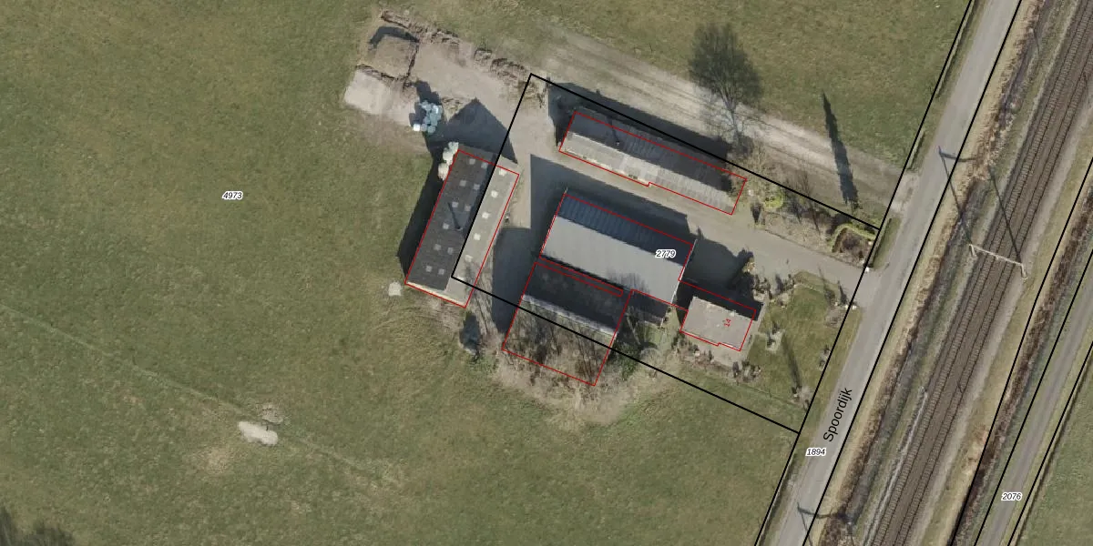 Het perceel waarop Spoordijk 14 staat heeft een oppervlakte van 2790 m². Dit is een zeer groot perceel. De perceeloppervlakte wordt geregistreerd door het Kadaster. Gedetailleerde informatie over de maten van dit perceel kunt u vinden in het rapport Kadastrale kaart met maatvoering van Spoordijk 14.