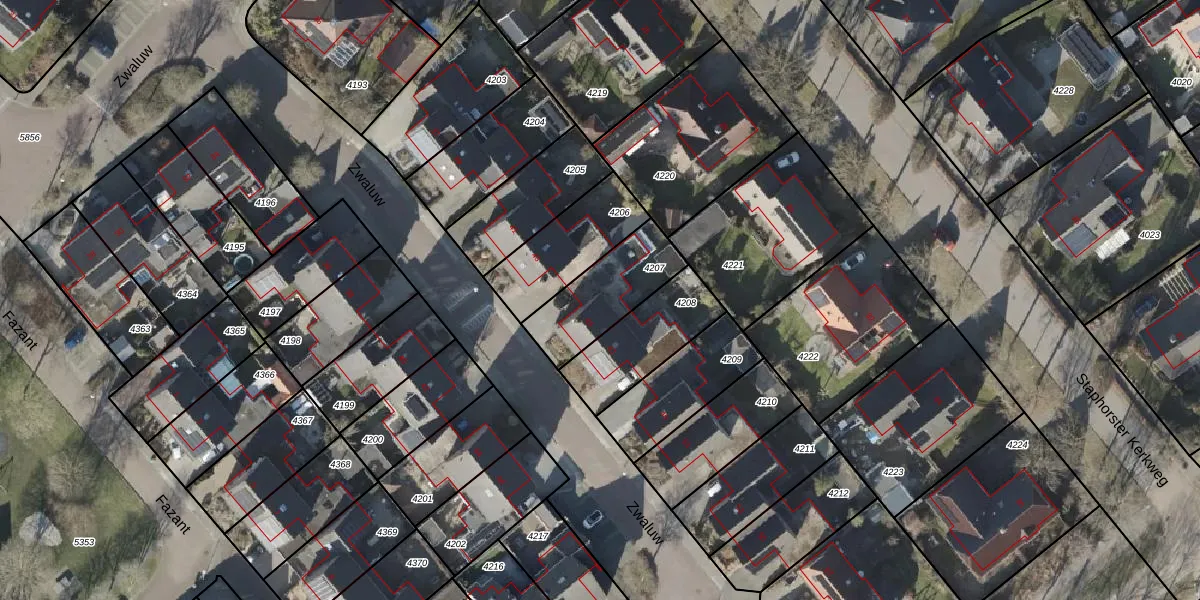 Zwaluw 45 is gelegen op kadastraal perceel SHT02AA4207. Deze kadastrale aanduiding is uniek en wordt gebruikt door het Kadaster om eigendomsrechten en andere zakelijke rechten vast te leggen. Het perceel maakt onderdeel uit van de kadastrale gemeente Staphorst.