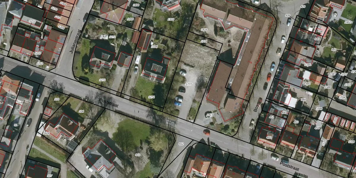 Het perceel waarop Poststraat 5-a staat heeft een oppervlakte van 836 m². Dit is een groot perceel. De perceeloppervlakte wordt geregistreerd door het Kadaster. Gedetailleerde informatie over de maten van dit perceel kunt u vinden in het rapport Kadastrale kaart met maatvoering van Poststraat 5-a.