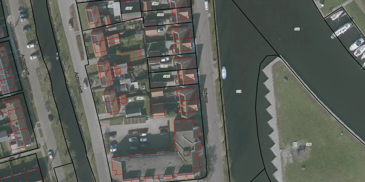 Het perceel waarop Schans 57 staat heeft een oppervlakte van 4549 m². Dit is een zeer groot perceel. De perceeloppervlakte wordt geregistreerd door het Kadaster. Gedetailleerde informatie over de maten van dit perceel kunt u vinden in het rapport Kadastrale kaart met maatvoering van Schans 57.