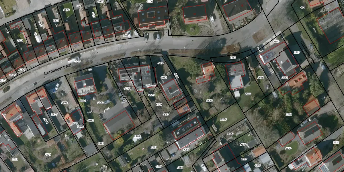 Het perceel waarop Corneliusstraat 40 staat heeft een oppervlakte van 315 m². Dit is een groot perceel. De perceeloppervlakte wordt geregistreerd door het Kadaster. Gedetailleerde informatie over de maten van dit perceel kunt u vinden in het rapport Kadastrale kaart met maatvoering van Corneliusstraat 40.