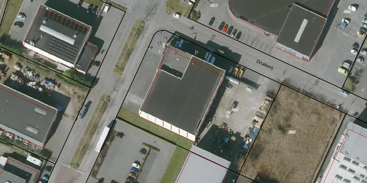 Het perceel waarop Drukkerij 2 staat heeft een oppervlakte van 4015 m². Dit is een zeer groot perceel. De perceeloppervlakte wordt geregistreerd door het Kadaster. Gedetailleerde informatie over de maten van dit perceel kunt u vinden in het rapport Kadastrale kaart met maatvoering van Drukkerij 2.