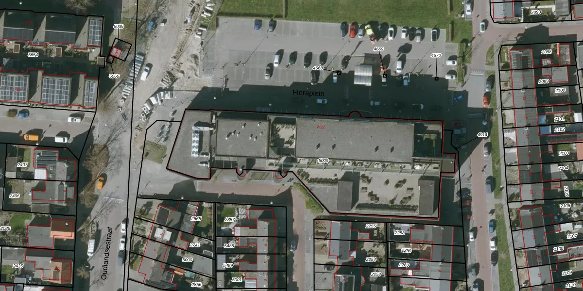 Het perceel waarop Floraplein 12 staat heeft een oppervlakte van 2492 m². Dit is een zeer groot perceel. De perceeloppervlakte wordt geregistreerd door het Kadaster. Gedetailleerde informatie over de maten van dit perceel kunt u vinden in het rapport Kadastrale kaart met maatvoering van Floraplein 12.