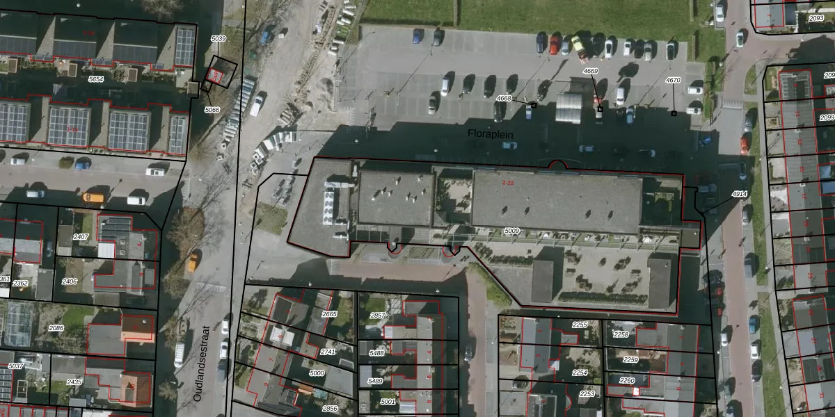 Het perceel waarop Floraplein 14 staat heeft een oppervlakte van 2492 m². Dit is een zeer groot perceel. De perceeloppervlakte wordt geregistreerd door het Kadaster. Gedetailleerde informatie over de maten van dit perceel kunt u vinden in het rapport Kadastrale kaart met maatvoering van Floraplein 14.