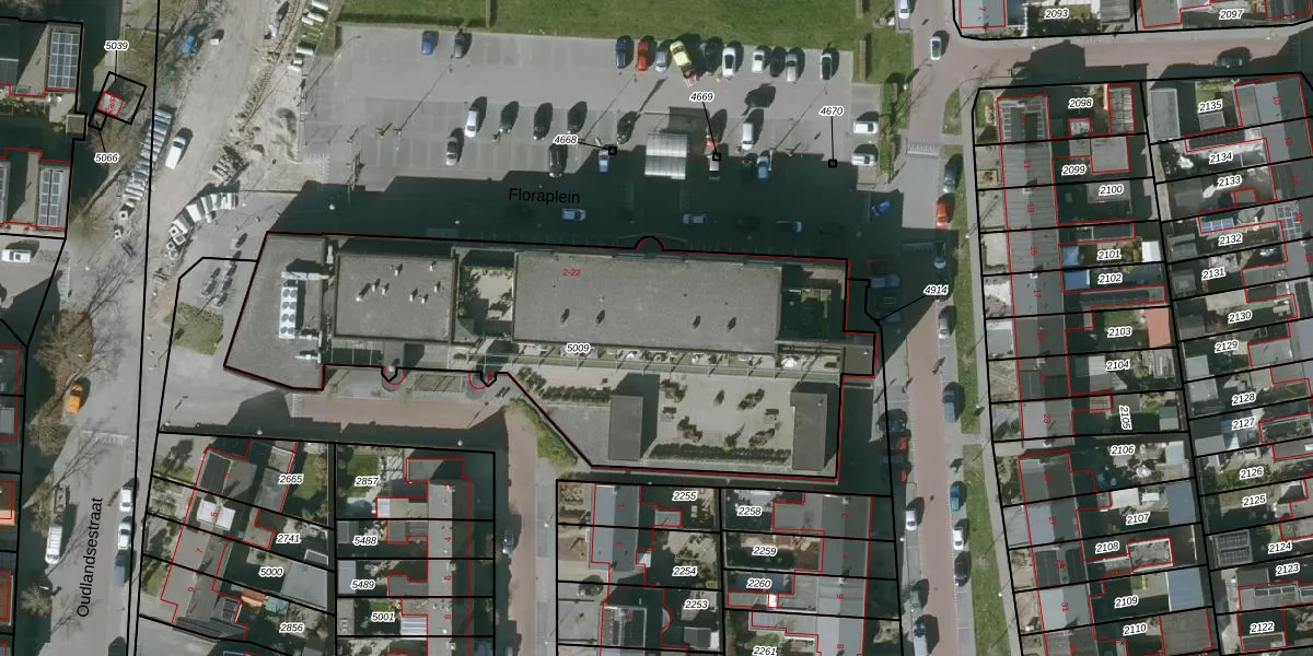 Het perceel waarop Floraplein 8 staat heeft een oppervlakte van 2492 m². Dit is een zeer groot perceel. De perceeloppervlakte wordt geregistreerd door het Kadaster. Gedetailleerde informatie over de maten van dit perceel kunt u vinden in het rapport Kadastrale kaart met maatvoering van Floraplein 8.