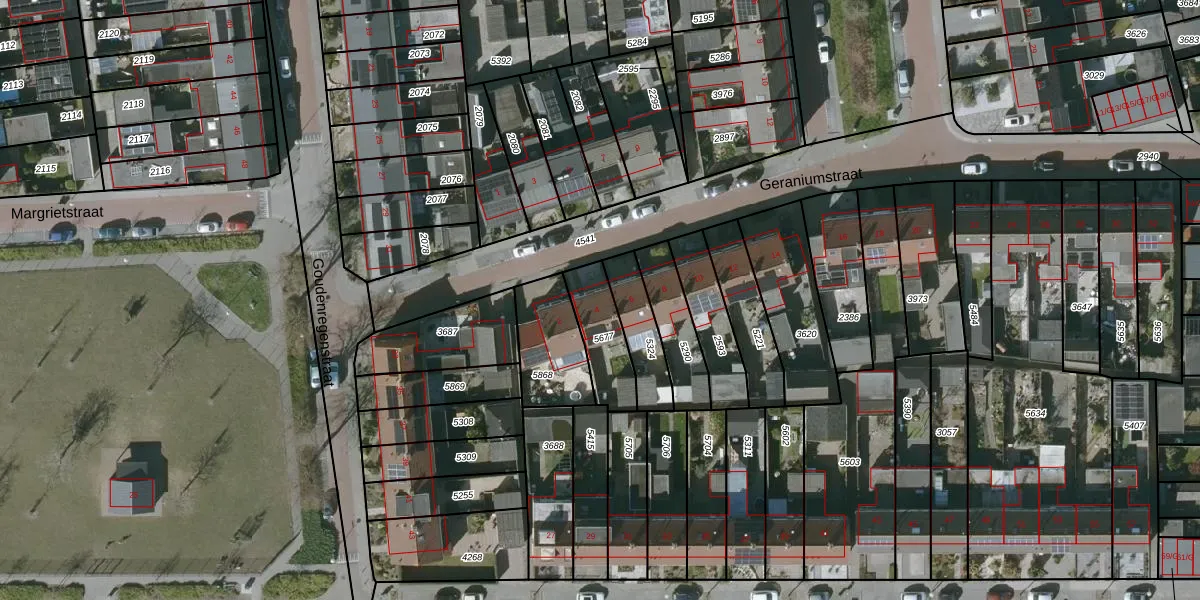 Het perceel waarop Geraniumstraat 4 staat heeft een oppervlakte van 172 m². Dit is een middelgroot perceel. De perceeloppervlakte wordt geregistreerd door het Kadaster. Gedetailleerde informatie over de maten van dit perceel kunt u vinden in het rapport Kadastrale kaart met maatvoering van Geraniumstraat 4.
