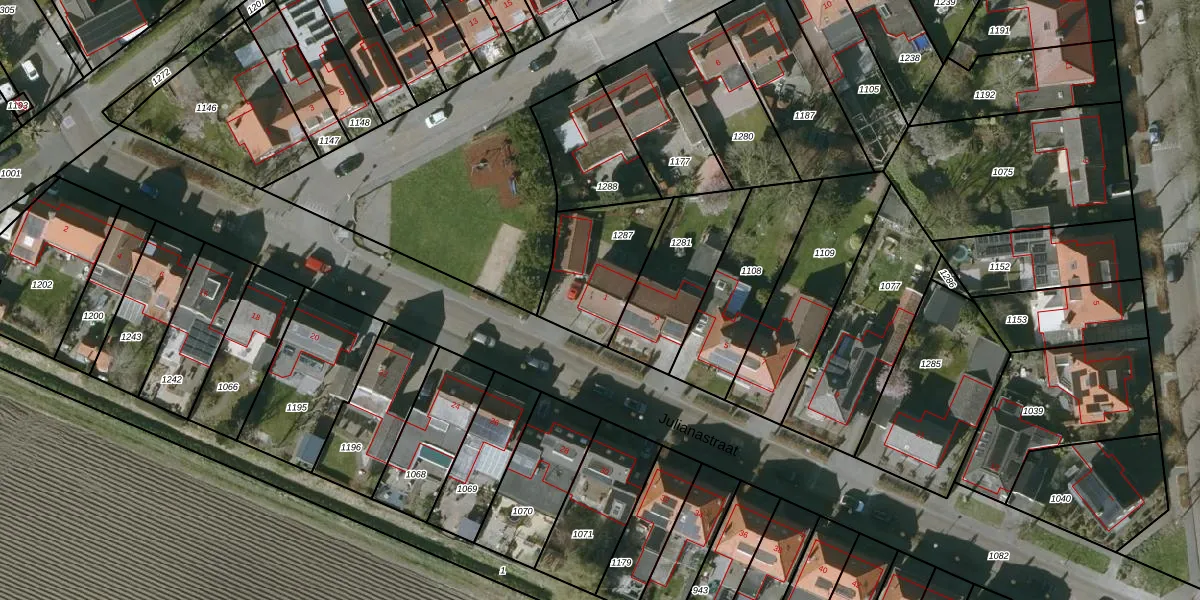 Het perceel waarop Julianastraat 1 staat heeft een oppervlakte van 337 m². Dit is een groot perceel. De perceeloppervlakte wordt geregistreerd door het Kadaster. Gedetailleerde informatie over de maten van dit perceel kunt u vinden in het rapport Kadastrale kaart met maatvoering van Julianastraat 1.