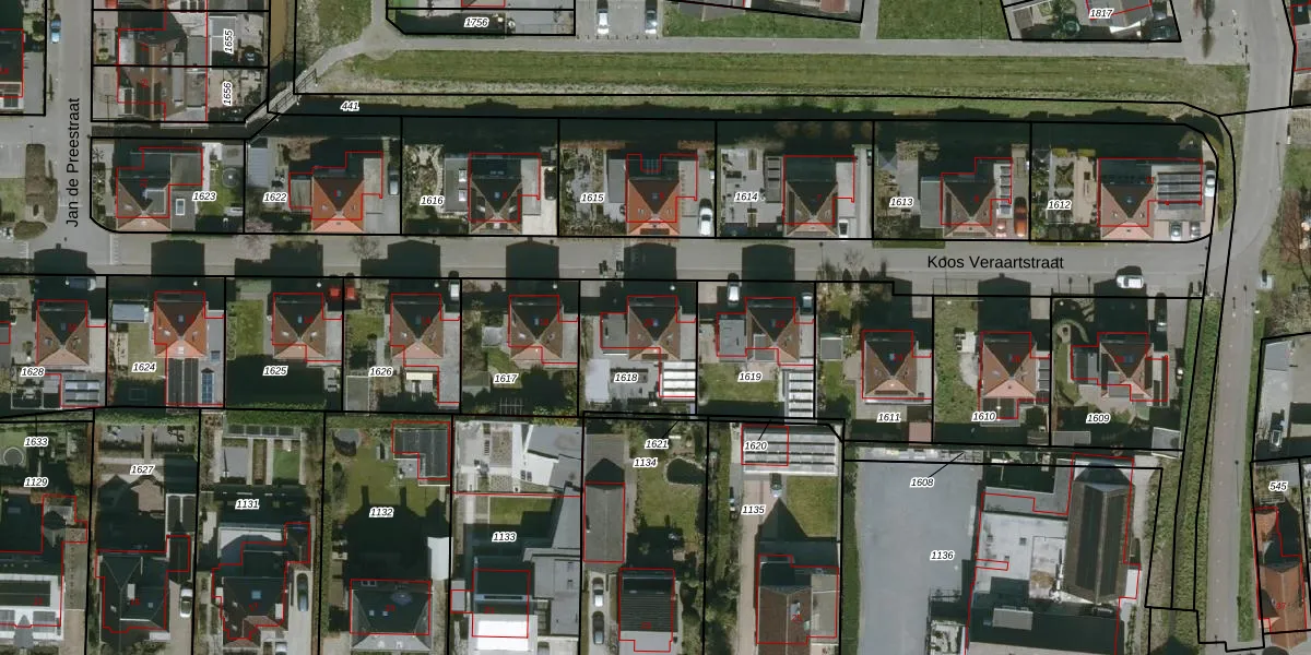 Koos Veraartstraat 20 is gelegen op kadastraal perceel SBG02F1618. Deze kadastrale aanduiding is uniek en wordt gebruikt door het Kadaster om eigendomsrechten en andere zakelijke rechten vast te leggen. Het perceel maakt onderdeel uit van de kadastrale gemeente Steenbergen.